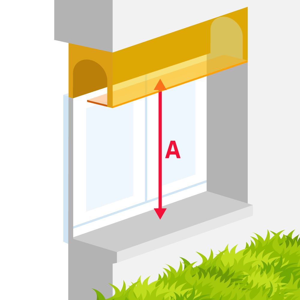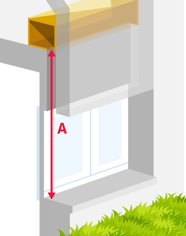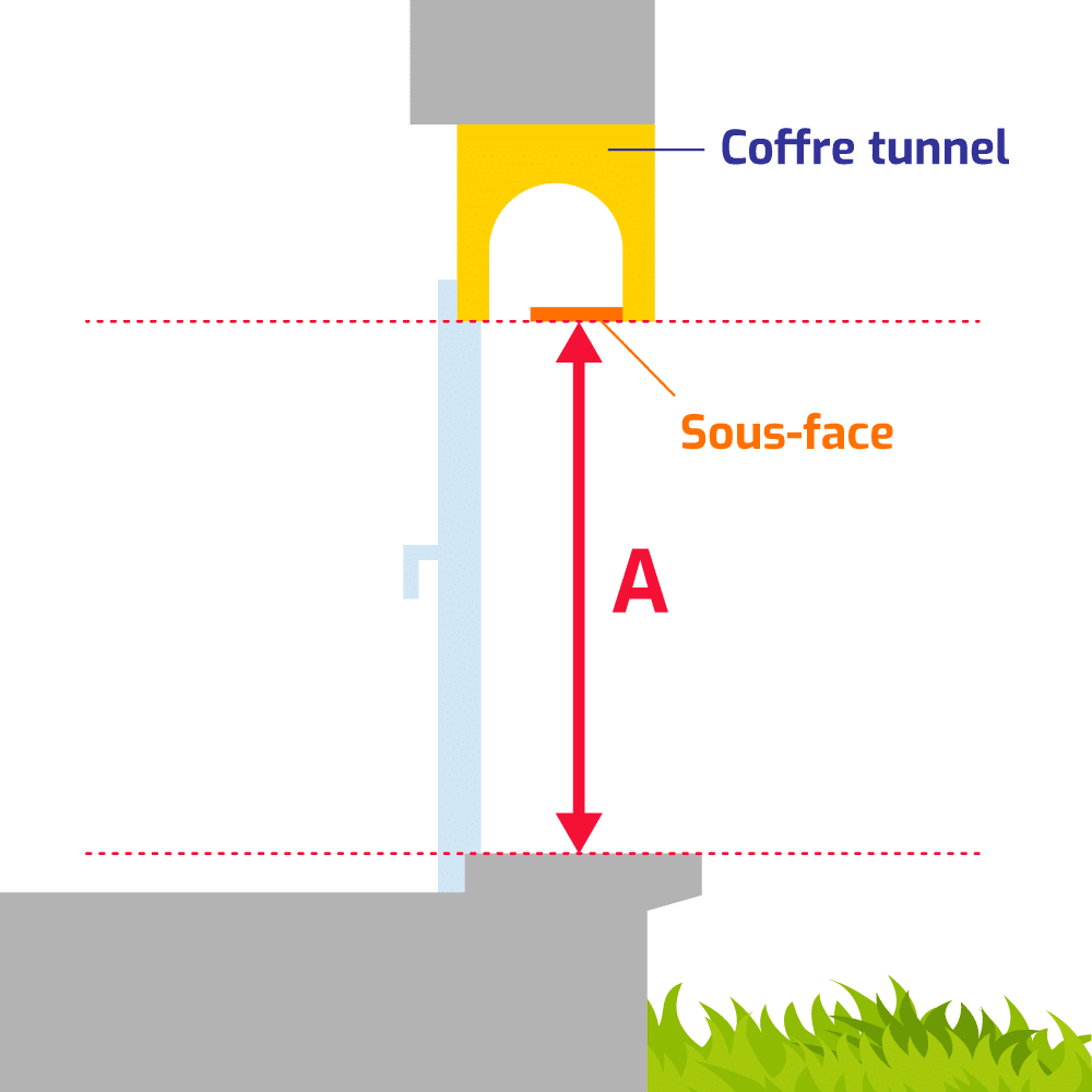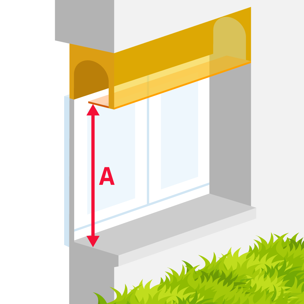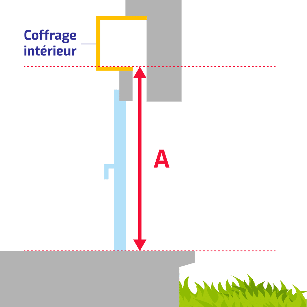 Pour la hauteur (A), mesurer la hauteur entre le bas du tableau de maçonnerie et le bas du coffrage existant en passant par la saignée prévue pour le passage de tablier du volet.