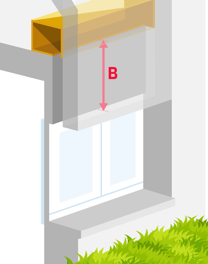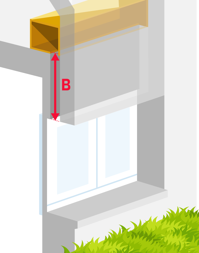 Pour la distance (B), mesurer la distance entre le haut du tableau de maçonnerie et le bas du coffrage situé en combles existant en passant par la saignée prévue pour le passage de tablier du volet.