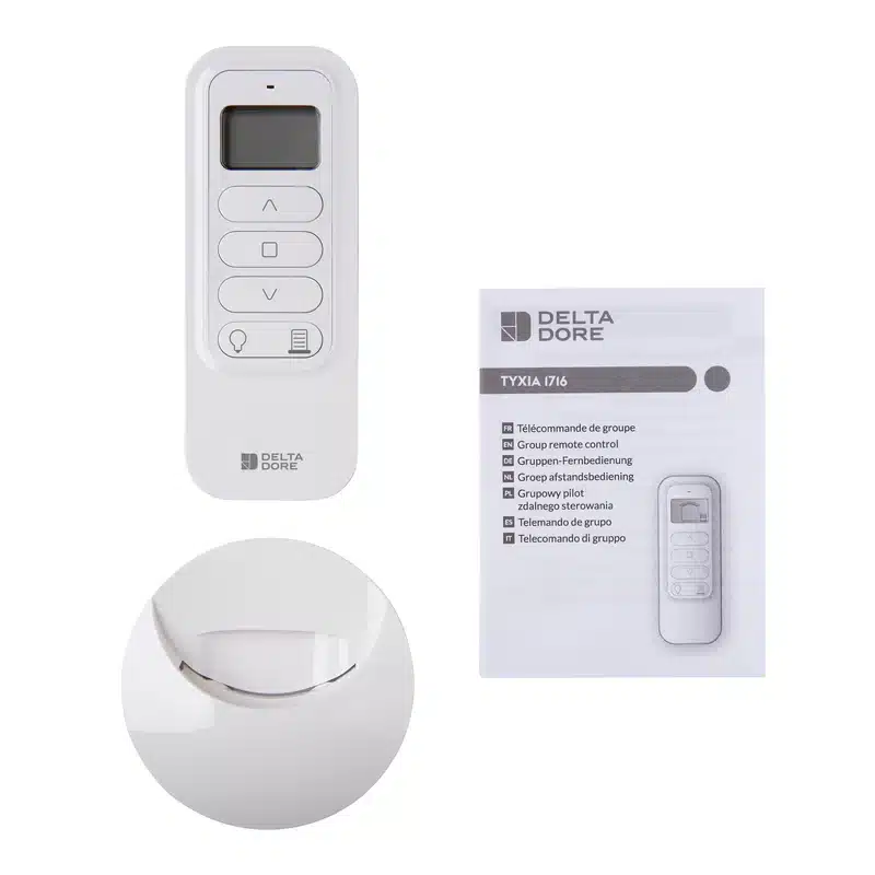 Télécommande radio 16 canaux permettant de piloter un ou plusieurs volets roulants dans 16 groupes différents (exemples : chambres, étage, salon, cuisine, général).